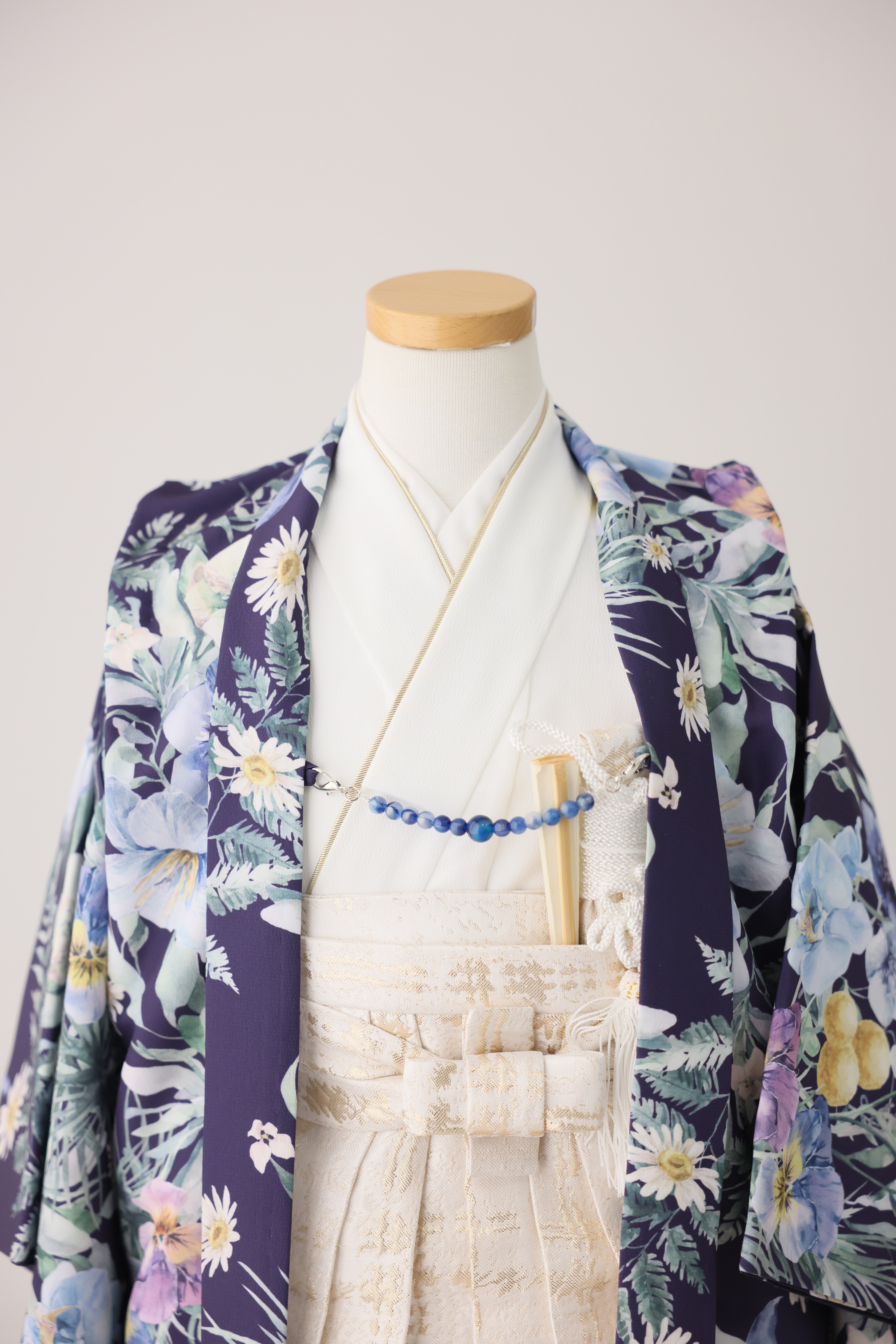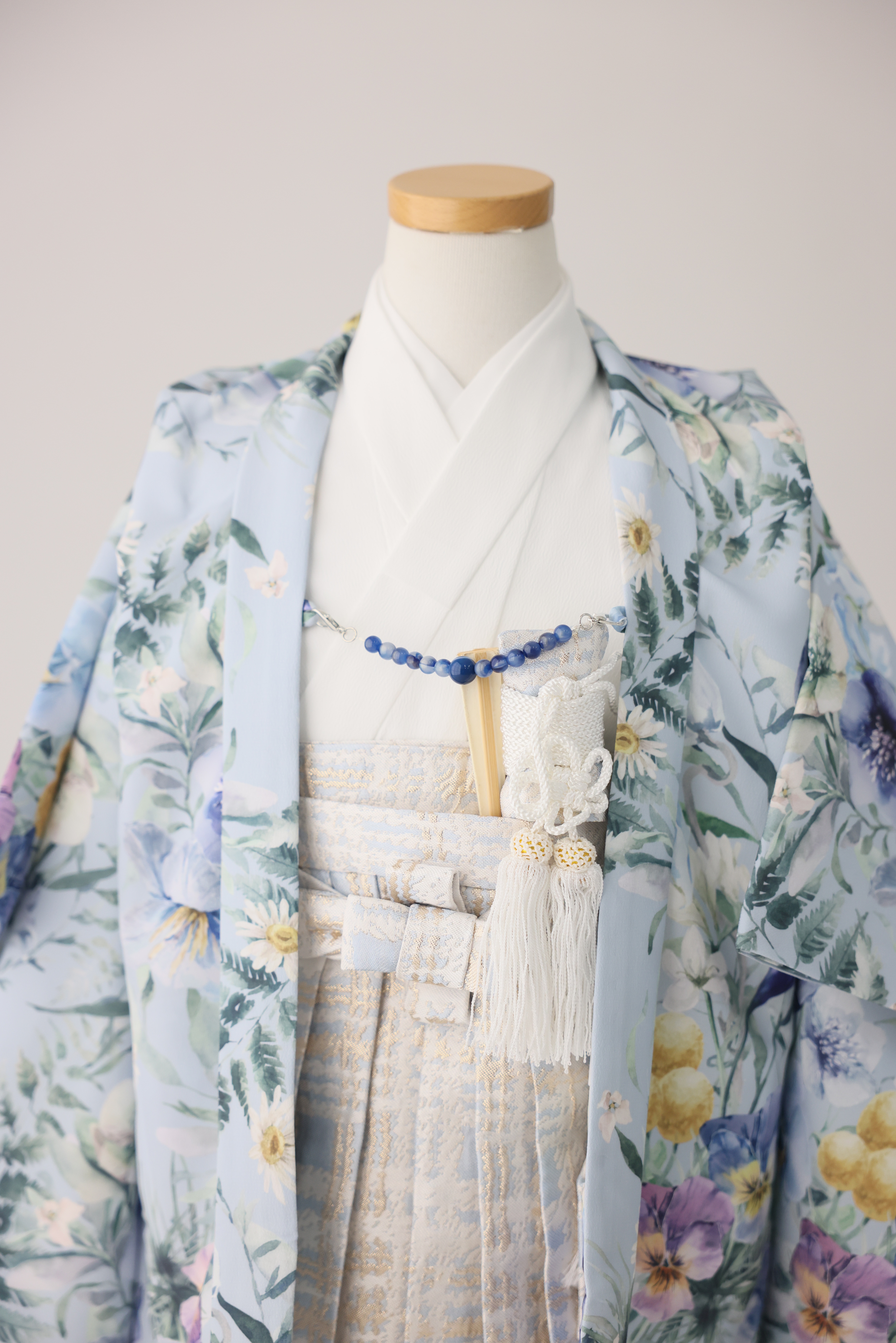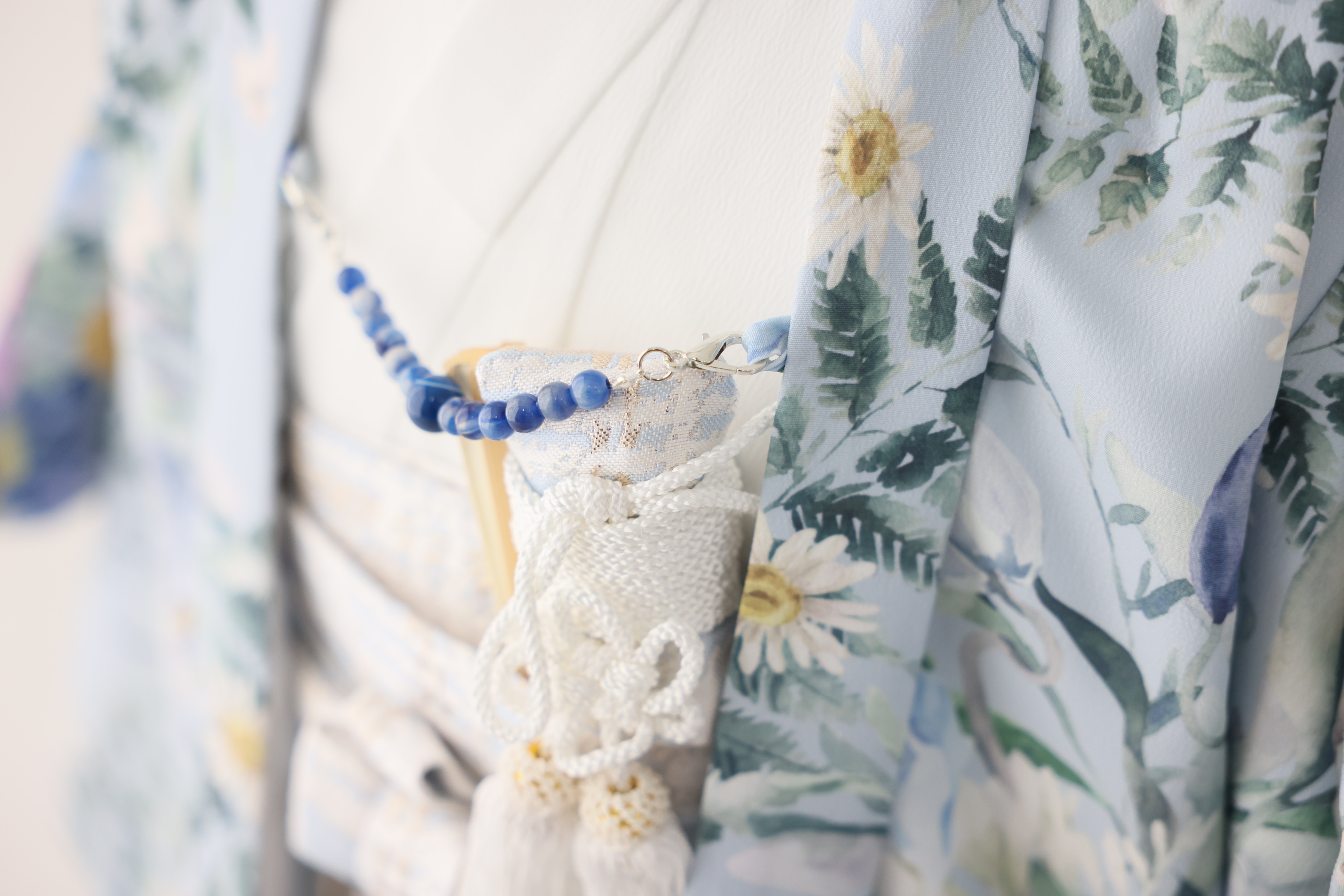 明るい水色にブルーのビジューが付いた羽織紐が差し色になっています!